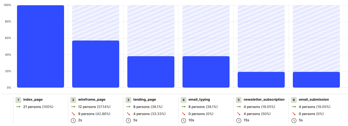 PostHog analytics was integrated into the main page, the landing page, and the wireframe page to track: